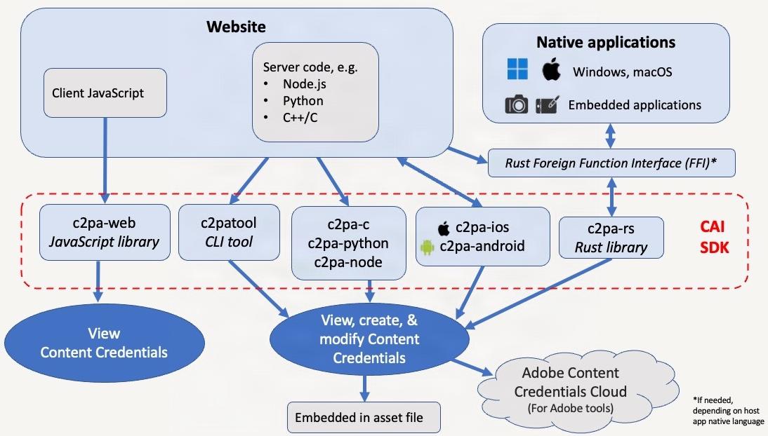 • C/C++, Python, Node.js libraries that enable applications to read and validate manifest data, create and sign manifest data, and embed it supported asset files.